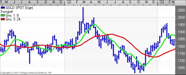 Guldet bevæger fortsat vandret i niveauet 1800-1850. Bollingerkanalen er i salg, mens der fortsat købssignal i de glidende gennemsnit. Det lange glidende gennemsnit ligger i niveauet 1780. Der er en faldende tendens i Momentum, mens RSI har etableret en bundformation og stiger.