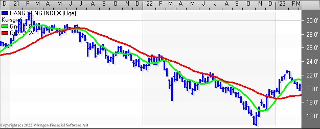 Hang Sang har fortsat salgssignal i både Bollingerkanalen og de glidende gennemsnit og det har stået på siden begyndelsen af februar. Men på ugebasis er der fortsat et købssignal i de glidende gennemsnit 8 og 24, mens Bollingerkanalen er gået i salg og har været det i en uge.