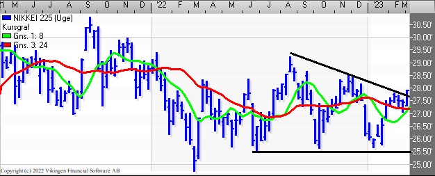 Det japanske marked fortsætter den vandrette formation mellem 27.000 og 28.000. Der er salgssignal på dagsniveauet i både Bollingerkanalen og det lange glidende gennemsnit ligger over det korte glidende gennemsnit, hvilket er et salgssignal i modellen.