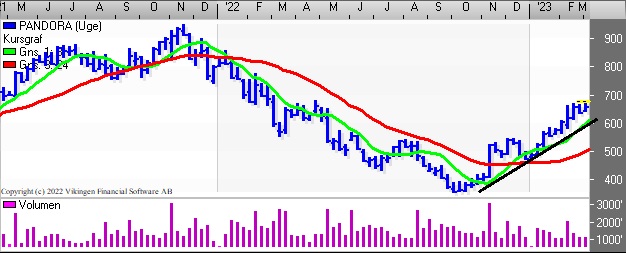 Pandora holder fast i den stigende tendens og det har stået på siden slutningen af september. På dagsniveauet etablerede de glidende gennemsnit et Golden Cross i begyndelsen af januar. Bollingerkanalen etablerede kortvarigt et salgssignal i slutningen af februar, men er i køb igen. På ugebasis er der en stigende tendens i de tre indikationsmodeller. RSI har ramt 88 og MACD er over middelværdien 0 på ugebasis. Momentum er igen brudt igennem det glidende gennemsnit nedefra, hvilket giver et positivt billede af tendens.
