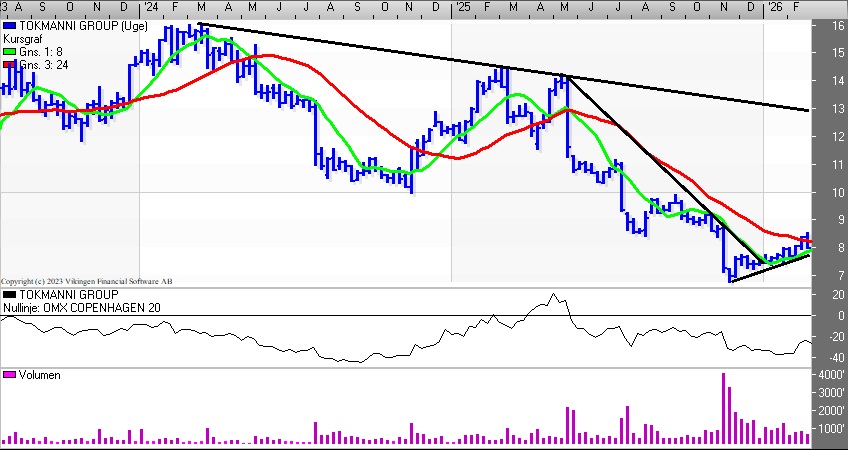 Er der en vending på vej i finske Tokmanni Group? Aktien har været i en stigende tendens siden bunden i november, hvor niveauet 6,8 blev testet. Nu handles aktien i niveauet 8,2-8,6.
