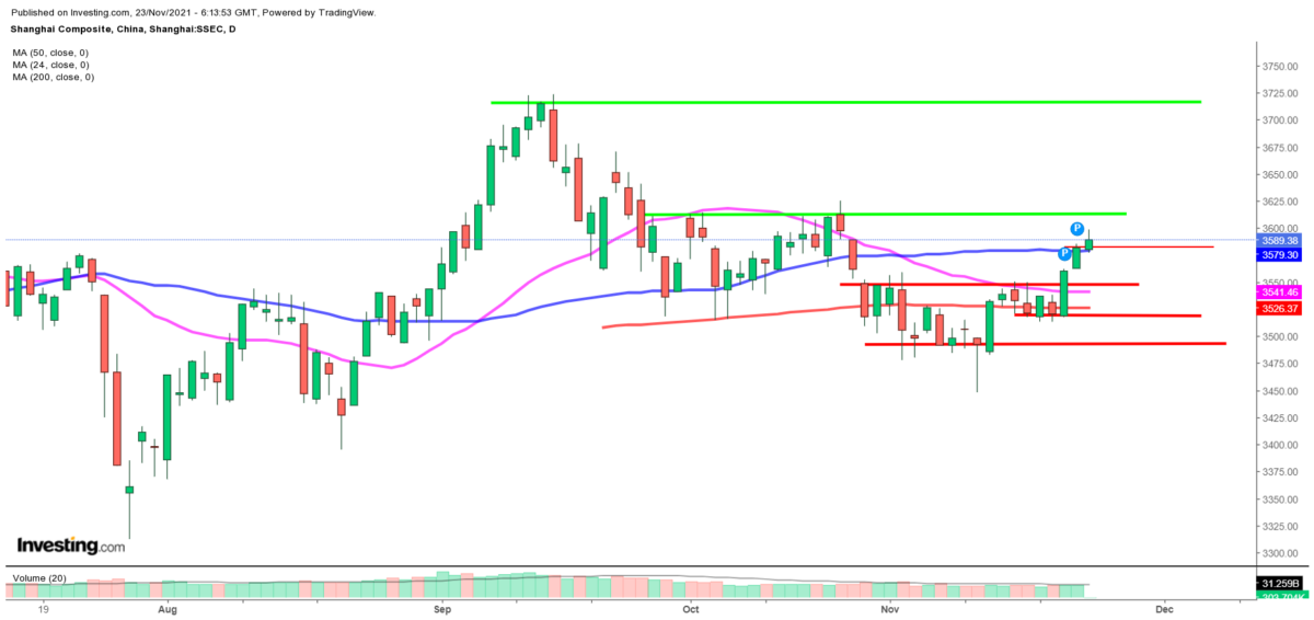 Ser vi på dagschartet for Shanghai indekset (plus 0,1 pct. (4 point) i 3.587 – (handles i skrivende stund, hvorfor tolkningen af signalerne kan ændres), er der tale om en fortsættelse af et udbrud af en sidelæns konsolidering gennem toplinien i 3.550 niveauet. Udviklingen bekræfter at udbrud skal følges.