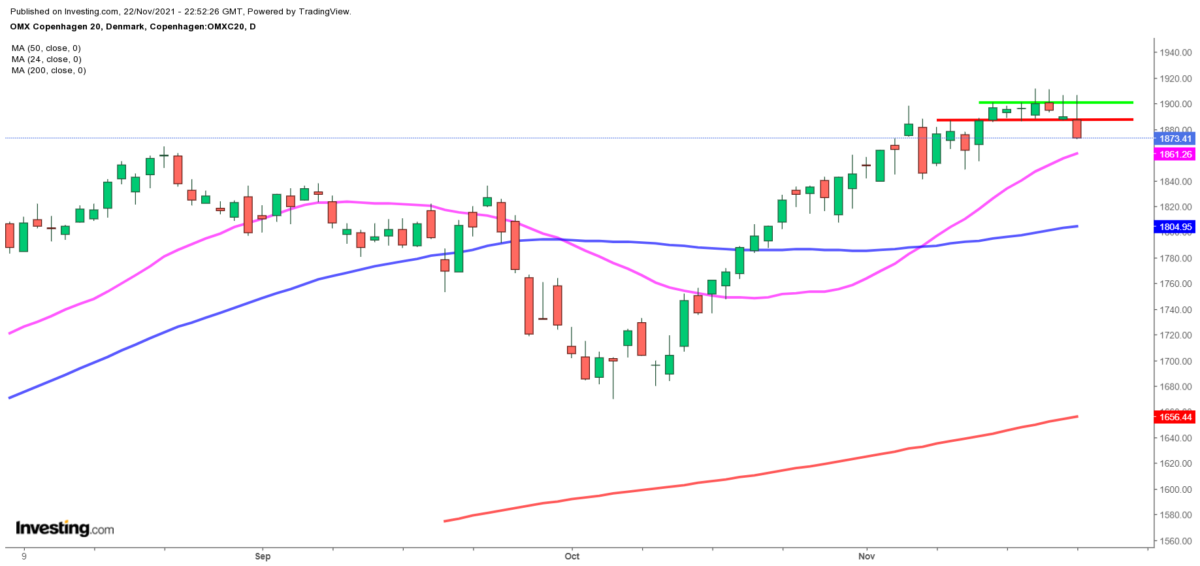 Ser BørsUdsigten på dagschartet for OMXC20 – minus 0,9 pct. (16 point) i indeks 1.873 – er der tale om et brud af støttelinien i 1886 niveauet udløser tertiært salgssignal.