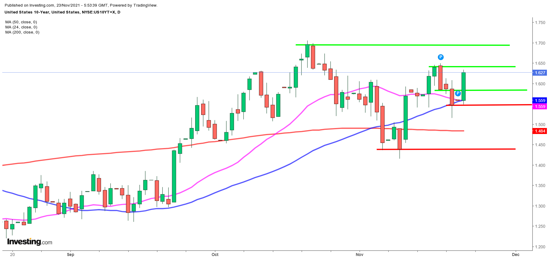 Ser BørsUdsigten på dagschartet for renten på den 10 årige amerikanske statsobligation (1,627 pct.) er der tale om en reversal, og et lille købesignal.