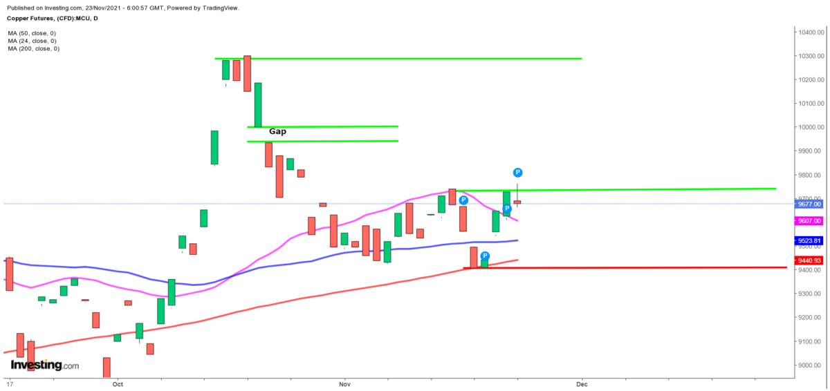 Ser BørsUdsigten på dagschartet for kobber (9.677 USD pr. ton) til morgen, tirsdag, er der tale om en stærk rebound. (3 soldater)