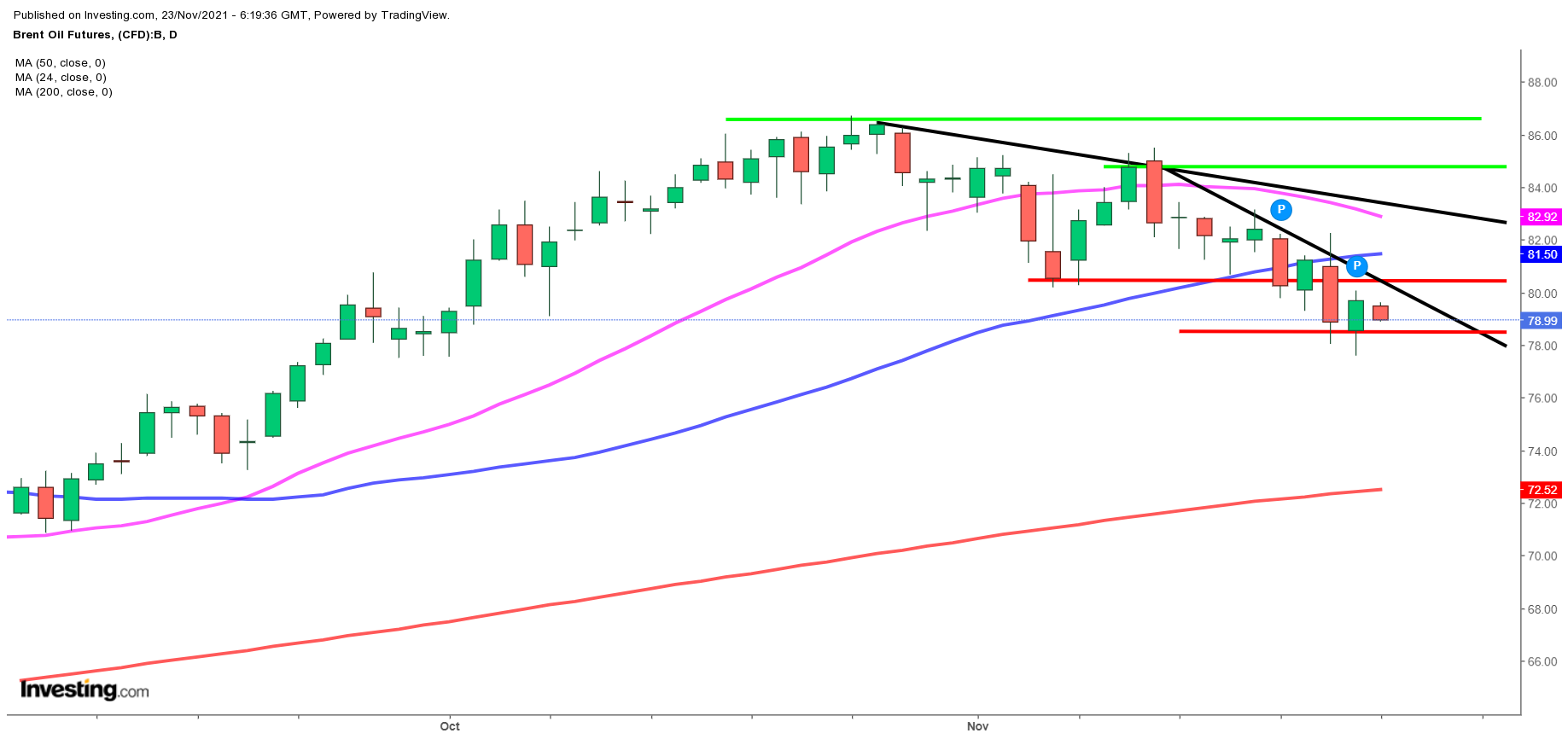 Ser BørsUdsigten på dagschartet for UK Brent (79) til morgen, tirsdag, er der tale om en accelererende nedtrend.