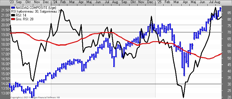 Nasdaq Composite er i køb både på dags- og ugeniveau for både kursgrafen og Bollingerkanalen. Der er divergens mellem RSI og Momentum på ugebasis. RSI stiger og er gået fra 80 til 82, mens Momentum falder og er brudt igennem det glidende gennemsnit oppefra.