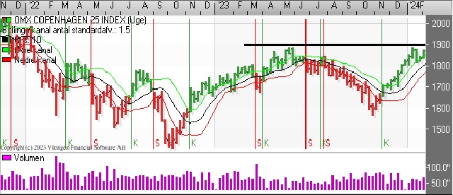 DSV fremlagde torsdag deres årsregnskab, der viste et fald i både omsætningen og resultatet efter skat. På dagsniveauet er der købssignal i kursgrafen og Bollingerkanalen. På ugebasis er der købssignal i Bollingerkanalen, og det blev etableret i midten af december. De glidende gennemsnit på ugebasis på 8 og 24 uger har etableret et Golden Cross den uge. Hvis DSV køber DB Schenker, skal de udvide kapitalen, og det kan sende kursen ned. Afvent udviklingen.