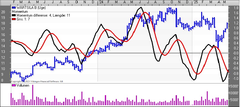 Den stigende tendens i aktiekursen løfter de tre indikationsmodeller på ugebasis. RSI er steget fra 32 til 45. Momentum er i en stigende tendens og har brudt det glidende gennemsnit nedefra. MACD er også i en stigende tendens, men har endnu ikke brudt det glidende gennemsnit. Modellen ligger fortsat under middelværdien.